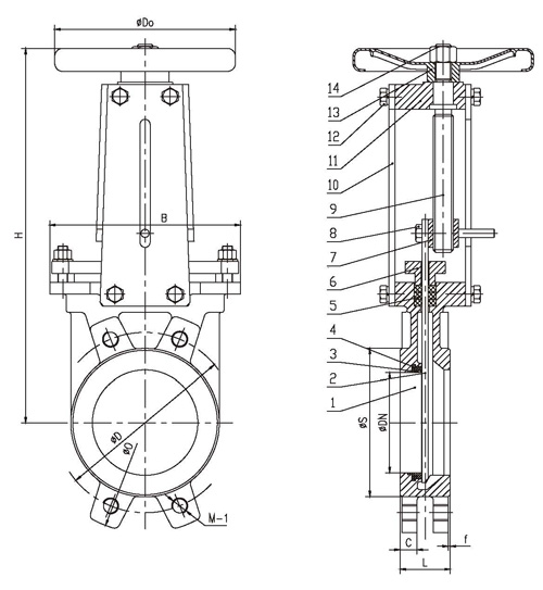 Knife gate valve with non-rising stem and handwheel are for wastewater treatment, slurry, ash, paper pulp 0℃ to +80℃.