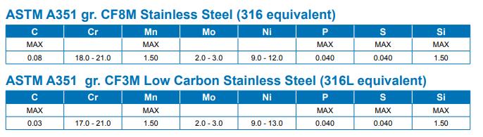 For the chart above, we learn that the CF3M and CF8M, the M is means the steel contains the Molybdenum elements. In this principle, the CF8M has better corrosion resistant ability than CF8; CF3M is better than CF3;