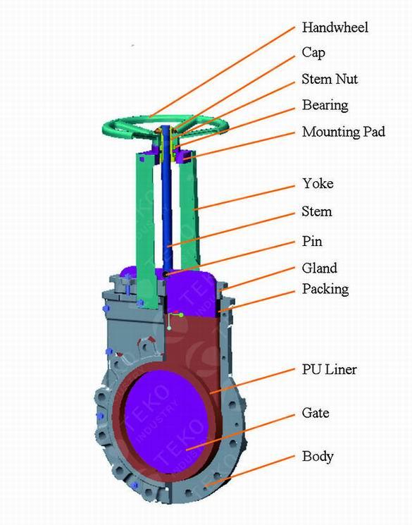 The TEKO knife valve features a polyurethane liner molded throughout the body and chest for reliable service in abrasive and corrosive applications.
